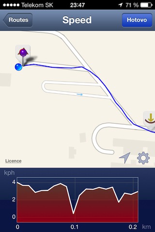 Ovšem to co mě na aplikaci skutečně nadchlo teprve přichází. U uložené trati najdete v dolním menu trojic symbolů z nichž dva jsou skutečně velmi zajímavé, detailně totiž informují o převýšení a rychlosti v aktuálním úseku. Posunem prstu po grafu rychlosti nebo nadmořské výšce totiž vidíte bod na mapě a okamžitě tak vidíte v jakém úseku jste jak klesali/stoupali nebo jeli rychle. Právě toto zobrazení se mi na celé aplikace líbí skutečně nejvíce a je možné se podle něj velmi přesně řídit při sestavování tréninkového plánu nebo například přípravy na závod, kdy vidíte kde máte rezervy a kde naopak můžete zvolnit tempo a uvolnit svalům.