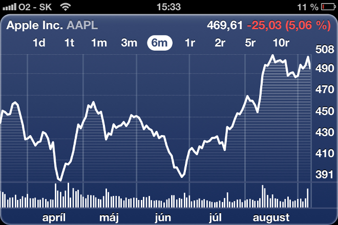 Včerajší Apple event a udalosti po ňom zrejme nepotešili akcionárov a tak sa stalo, že hodnota akcií AAPL miesto toho, aby narástla, sa za uplynulú noc prudko prepadla o približne 5%. Kým Apple včera ukončil svoj deň s hodnotou akcií 494.66 dolárov na akciu, dnes začína s ešte nižšou hodnotou – $469.61 / kus.