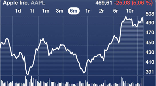 Včerajší Apple event a udalosti po ňom zrejme nepotešili akcionárov a tak sa stalo, že hodnota akcií AAPL miesto toho, aby narástla, sa za uplynulú noc prudko prepadla o približne 5%. Kým Apple včera ukončil svoj deň s hodnotou akcií 494.66 dolárov na akciu, dnes začína s ešte nižšou hodnotou – $469.61 / kus.