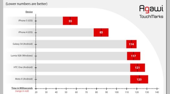 Dotykový displej iPhone má dvojnásobně rychlejší reakci než ostatní Android a Windows smartphony, vyplývá to z testu společnosti Agawi, která provedla testy rychlosti odezvy displeje u různých Android, Windows Phone a iOS zařízení. Samotné měření je přitom velmi zajímavé a probíhá pomocí fotoaparátu, který dokáže zaznamenávat video v rychlosti 240 fps a na míru zhotoveného přístroje, který se označuje jako Touchscope. Agawi pak dokáže změřit latenci od okamžiku, kdy se uživatel dotkl displeje přístroje do chvíle než přístroj na tento dotyk zareagoval. K tomu se samozřejmě používá kromě dvojice výše uvedených hardwarových hraček také speciální aplikace. Latence se pak měří v milisekundách, kde je čím nižší naměřená hodnota tou lepší.