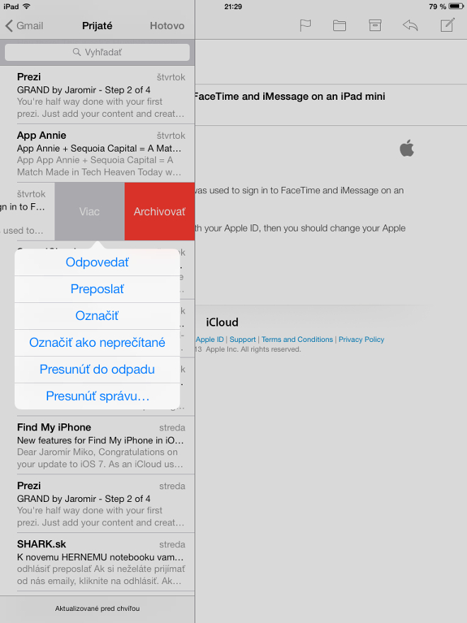 Apple sa tak vo svojom novom systéme rozhodol mierne inšpirovať e-mailovým klientom Mailbox, a tak majú používatelia iOS 7 a Gmail novú možnosť, ako rýchlejšie preorganizovať svoje správy. Tento oceníte nielen na iPade, ale aj na iPhone a iPode touch – všetko sa dá spraviť v zozname prijatých e-mailov. Jediné, čo teraz stačí, je posunúť prst smerom sprava doľava pri konkrétnej správe, čím sa vysunie ponuka možností. Okrem toho, že sa tu nachádza červené tlačítko Archivovať, nachádza sa tu aj ponuka Viac, ktorá obsahuje ďalšie užitočné možnosti, ktoré môžete vidieť nižšie. Tlačítko Presunúť do odpadu pritom nepresunie vybraný e-mail do koša, ale do spamu. Čo ale treba spraviť v prípade, že chcete správu trvalo vymazať? V takom prípade vykonajte nasledujúce kroky: