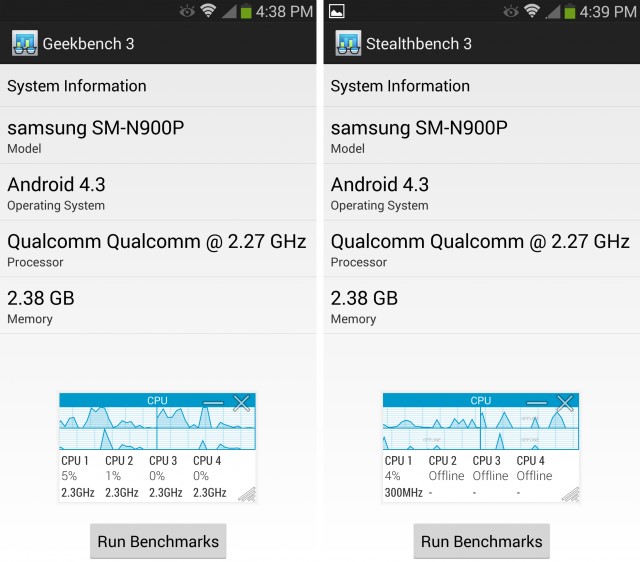Ako neskôr zistil server, trik je zakorenený hlboko v systéme a procesor v Galaxy Note III jasne vie, kedy spustíte benchmark aplikáciu – stačí, ak vie jej názov. A práve to je spôsob, ako je možné trik obísť a odhaliť tak pravý výkon zariadenia. ArsTechica preto zmenil názov aplikácie GeekBench a spustil ju pod novým názvom – drastický rozdiel vo výkone je možné vidieť na obrázku vyššie. Samotný prístroj tak dokáže v multi-core teste prezentovať až o 20% vyššie výsledky ako by v skutočnosti mal, a zatiaľ čo hodnota Integer v skutočnosti predstavuje 2 800 bodov, v benchmarkoch sa jedná až o 3 600 bodov. Podobná situácia nastáva aj v celkovom vyhodnotení, kde Galaxy Note III dosahuje 2 986 bodov, aj keď v skutočnosti by mala dosahovať iba 2 487 bodov. Samozrejmosťou je nakoniec spomínaný kód pre benchmark aplikácie. Po jeho prekompilovaní do Javy v ňom vidíme zoznam 25 aplikácií, ktoré majú využívať maximum výkonu.