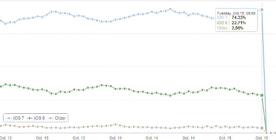 Podľa štatistiky zo serveru Mixpanel je tiež zrejmé, že na nový iOS 7 začali ľudia prechádzať rýchlejšie ako na minuloročný iOS 6. Zatiaľ čo minuloročnému iOS 6 trvalo 30 dní, kým dosiahol podiel 61%, radikálne zmenený iOS 7 dosiahol rovnaký podiel už za osem dní. V súčasnosti sa iOS 7 nachádza na 74,33% všetkých aktívnych iOS zariadení, pričom podiel iOS 6 sa znížil len na 22,71%. Staršie verzie operačného systému sa dnes nachádzajú na 2,96% aktívnych zariadení. Vďaka štatistike a oznámeniu, že sa iOS 7 nachádza na viac ako 200 miliónoch zariadení, vieme usúdiť, že z celkového počtu predaných iOS zariadení je dnes v obehu len približne polovica z nich. Spoločnosť oznámila túto správu v dobe, keď sa iOS 7 nachádzal na 57,92% prístrojoch, teda vieme usúdiť, že je dnes aktívnych len približne 345 miliónov zariadení z celkového počtu 700 miliónov predaných zariadení, a až 255 miliónov z nich dnes využíva operačný systém iOS 7.