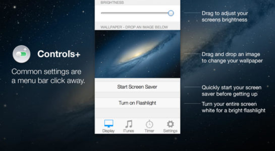 Do menuBar můžeme přidávat nesmysly od výmyslu světa již od první verze OS X. Nyní však přichází zajímavá novinka, která všechny tyto aplikace, utility a drobnosti sjednocuje, tedy alespoň ty, které se skutečně hodí. Po vzoru iOS 7 nyní přichází do našich menuBar nová utility s názvem Controls+, která v jedné jediné ikoně nabídne rovnou několik funkcí. Můžete nastavit jas, přetažením obrázku na ikonu změnit pozadí plochy, spustit spořič obrazovky, nastavit bílé pozadí plochy pro videohovory v slabě osvětlené místnosti, ovládat iTunes nebo spustit stopky, případně časovač. To vše v jediné ikone, po jejímž rozkliknutí se zobrazí kompletní nabídka funkcí.