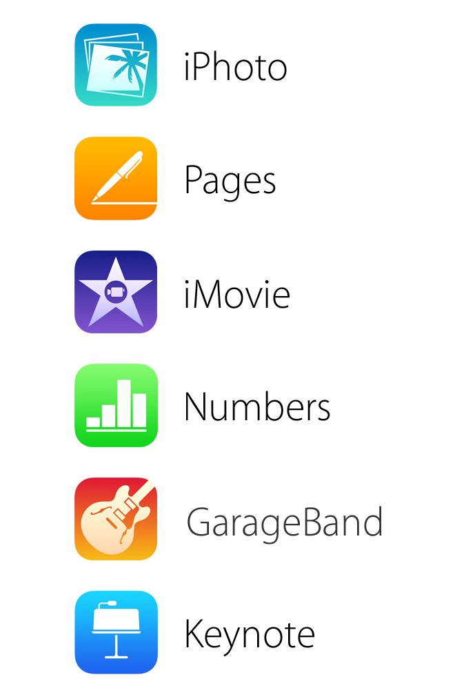 Apple už približne dve hodiny po skončení eventu aktualizoval všetky aplikácie, na ktoré upozornil, a tak sa v ponuke App Store stretávame s novými verziami aplikácií Pages, Numbers, Keynote, iPhoto, iMovie a GarageBand. S výnimkou GarageBand sa Apple rozhodol zverejniť všetky aplikácie iba v podobe update, ktorý zároveň navýšil systémové požiadavky. Všetky nové aplikácie sú od dnešného dňa dostupné iba pre iOS 7 a novšie, čomu Apple prispôsobil aj nové, ploché ikony po vzore prostredia iOS 7.