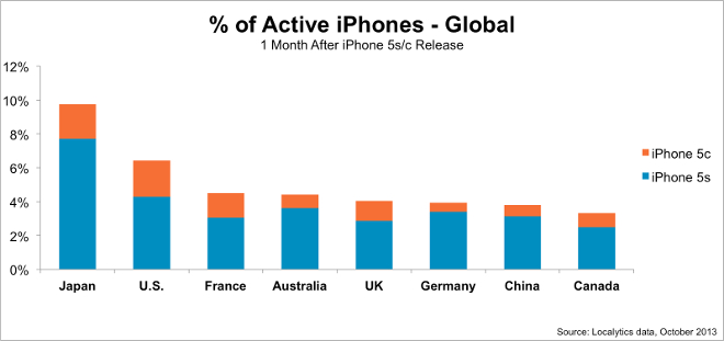 Najväčší záujem o nový iPhone doteraz prejavili v Japonsku, kde sa nachádza takmer 10% všetkých aktívnych modelov iPhone 5s a iPhone 5c. USA sa nachádza na druhom mieste s podielom 6,4%, z čoho až jednu tretinu tvorí plastový iPhone 5c. V Nemecku sa viditeľne viac užívateľov obracia k iPhone 5s, vďaka čomu na tamojšom trhu tvorí až 87% všetkých nových iPhonov. Spoločnosť Localytics ďalej uvádza, že v prípade tohto prieskumu analyzovala celkovo 40 miliónov unikátnych zariadení Apple iPhone.