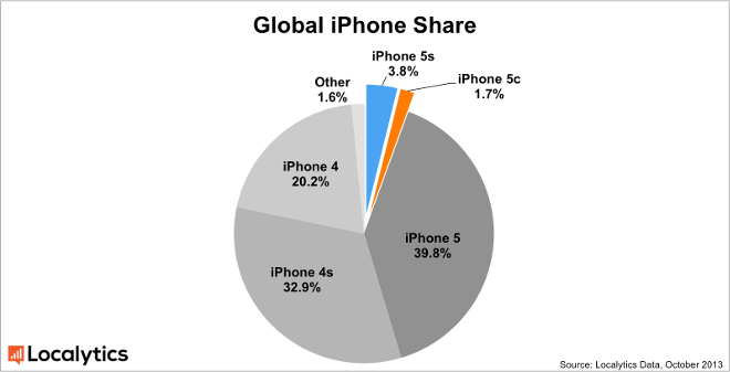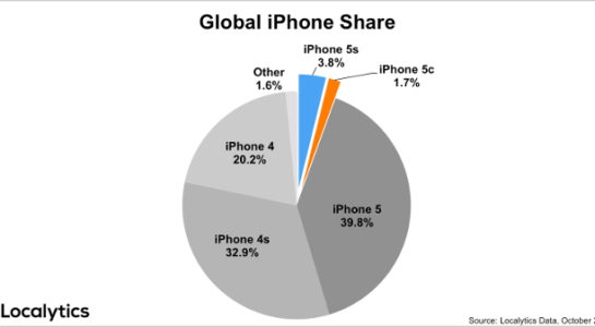 Podľa Localytics tak dnes oba nové telefóny predstavujú 5,5% všetkých aktívnych iPhonov, pričom iPhone 5s je na štvrtom mieste s 3,8% a iPhone 5c na piatom mieste s 1,7%. Podiel plastového iPhonu na trhu je nižší zrejme aj kvôli jeho cene, a to môže mať na svedomí, že je jeho podiel o 55% menší v porovnaní s iPhone 5s, a len tesne tak predbieha všetky predchádzajúce modely iPhone. Podiel dvoch nových iPhonov po mesiaci predaja je zatiaľ nižší ako u ostatných troch telefónov, pričom iPhone 4 aj dnes predstavuje 20,2% všetkých aktívnych iPhonov a je tak na treťom mieste. Predbiehajú ho tak už len novšie modely iPhone 4S s 32,9% a iPhone 5 s 39,8% podielom na trhu.