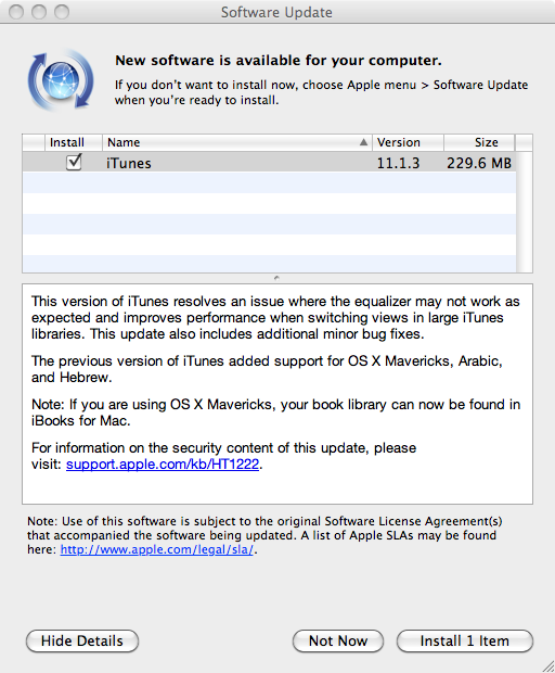 Apple komentuje iTunes 11.1.3 tak, že řeší problém při kterém ekvalizér nemusel fungovat a zlepšuje výkon při přepínání náhledů alb u velkých knihoven iTunes. Aktualizace obsahuje také další drobné opravy chyb a zvyšuje stabilitu a bezpečnost iTunes.