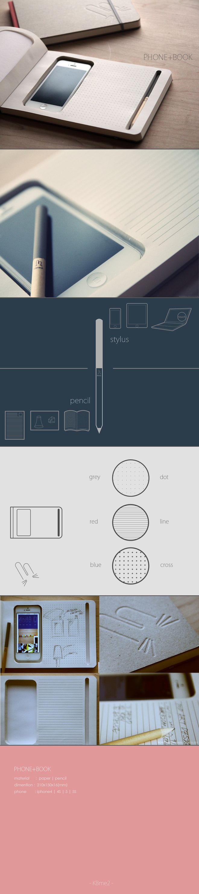 Tchajwanský designér vystupující pod přezdívkou KBme2 představil velmi zajímavý koncept, který spojuje iPhone s klasickým papírovým zápisníkem. Jednoduše otevřete svůj zápisník a vložíte do něho telefon, na kterém můžete mít informace v digitální podobě, které převádíte do té klasické. Přece jen ještě stále existují situace, kdy je tužka a papír nenahraditelný a právě na to vsází také nový návrh od KBme2. Součástí notesu je také tužka se stylusem, kde zatím co jednou stranou můžete psát na papír, druhou lze ovládat displej telefonu nebo multimediálního přehrávače iPod touch.