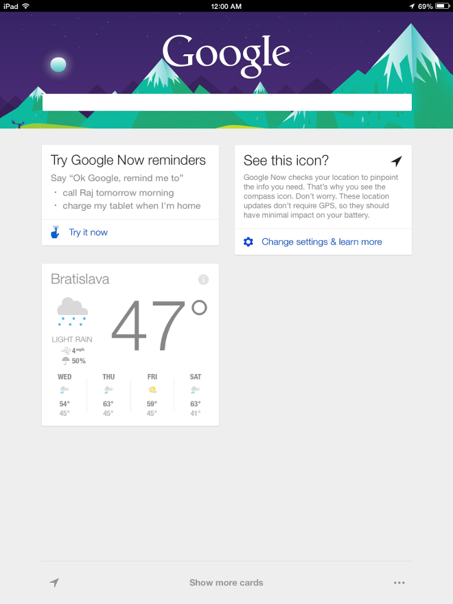 Google včera vydal významnú aktualizáciu pre Google Search, ktorá priniesla veľa zmien pre integrovanú službu Google Now. Bohužiaľ táto služba nie je bežne dostupná na území ČR a SR a namiesto toho, aby si mohli naši čitatelia vyskúšať, ako funguje odpoveď Googlu na Siri, sa dočkali nemilého upozornenia, že táto služba u nás nie je podporovaná. Existuje však spôsob, ako službu sprevádzkovať aj u nás, na našich zariadeniach? Áno, existuje. O to viac poteší skutočnosť, že k tomu netreba používať jailbreaknuté zariadenie, a tým pádom je trik funkčný aj na zariadeniach s iOS 7.