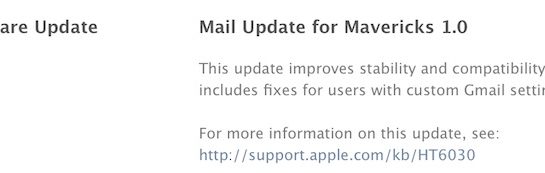 Apple vydal aktualizaci Mail Update for Mavericks 1.0, která přináší zlepšení kompatibility aplikace Mail s účty Gmail, které se některým uživatelům nedařilo synchronizovat s aplikací. Aktualizace opravuje problém, který bránil mazání, přesouvání a archivování zpráv pro uživatele, kteří používají Gmail. Dále pak aktualizace opravuje problém, díky kterému aplikace Mail ukazovala mylné informace o nepřečtených mailech.