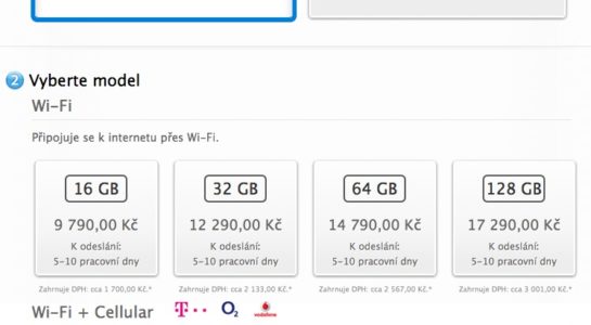 V případě Wi-Fi verze se 16GB model iPad mini s Retina displejem začíná prodávat za cenu 9 790Kč, 32GB model za 12 290Kč, 64GB model za 14 790Kč a nejnovější přírůstek v portfoliu iPadů mini, tedy model se 128GB pamětí pořídíte za 17 290Kč. Ceny u Wi-Fi+Cellular verzí, tedy iPadu mini s Retina displejem, do kterého je možné vložit SIM kartu jsou 12 990Kč za 16GB model, 15 490Kč za 32GB model, 17 990Kč za 64GB model a nakonec 20 490Kč za 128GB model.