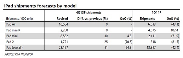 Situácia by sa mala aspoň čiastočne zlepšiť v prvom štvrťroku 2014, keď by podľa analytika mohol počet expedovaných kusov vzrásť o 102,4%, teda na 4 575 000 kusov. Už teraz je preto jasné, že sa Apple nedokáže pripraviť na vianočný trh, kde je práve iPad mini s Retina displejom veľmi žiadaný. Nedostatok kusov spočíva podľa všetkého v nedostatku Retina displejov, s ktorého výrobou sú problémy. Čísla sú v prípade iPad Air omnoho lepšie, keďže Apple má v tomto štvrťroku expedovať 10 564 000 kusov. V budúcom štvrťroku sa výroba zníži, pričom Ming-Chi Kuo očakáva 6 013 000 expedovaných kusov. Prvý štvrťrok 2014 bude zároveň obdobím, keď Apple ukončí výrobu iPadu 2 a začne s jeho dopredajom. Počet expedovaných kusov by sa mal do marca/března znížiť z 1 721 000 kusov iba na 318 000, zatiaľ čo Apple bude pokračovať s výrobou iPadu mini 1. generácie. Podľa analytika by sa mal počet expedovaných kusov v budúcom štvrťroku znížiť na 2,4 milióna kusov.