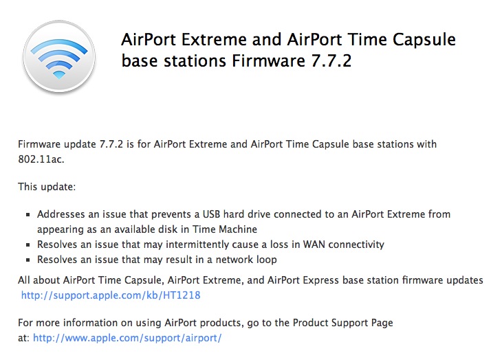 Apple dnes vydal novú aktualizáciu pre tohtoročné modely AirPort Extreme a AirPort Time Capsule s podporou štandardu 802.11ac. Nová aktualizácia nesie označenie Firmware Update 7.7.2 a rieši tri hlavné problémy, ktoré mohli strpčovať život majiteľom týchto produktov.