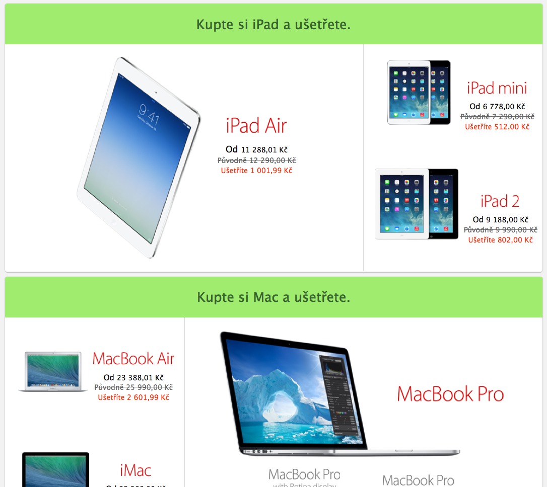 K nákupu na Apple.cz totiž dnes na Černý pátek nezískáte žádný bonus a poukázku, ale Apple.cz snížil ceny vybraných produktů a to nejen těch, které jsou přímo od Applu, ale také těch, které pochází od obchodních partnerů společnosti, kteří prodávají na Apple.cz, zákazníci navíc získají také poštovné zdarma. Co je zřejmě nejzajímavější je fakt, že Apple.cz nabízí slevu i na nejnovější produkty jako je například iPad Air. Nakupovat se slevou můžete až do 23:59 hodin dnes v pátek 29. 11. 2013 přímo zde.