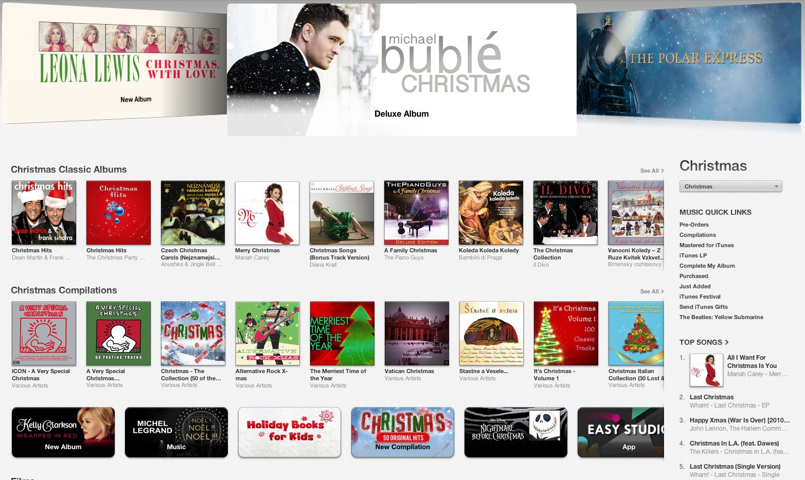 Společnost také aktualizovala svoji aplikaci Apple store, ve které již od léta letošního roku nabízí zdarma vybrané knihy a aplikace. Tentokrát mají zákazníci v USA využívající aplikaci Apple Store možnost poslouchat zdarma devět vybraných písní s Vánoční tématikou, což se však našich krajin netýká. Pokud jste tedy netušili čím si na svých iOS zařízeních nebo přímo v iTunes na počítači navodit atmosféru Vánoc a prozatím to u vás doma vypadá spíše jak po výbuchu atomové bomby než jako při chystání na Vánoce, stačí se podívat do nové sekce Christmas.