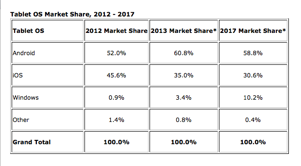 Polepšil si také Windows, ovšem jeho podíl na trhu je stále velmi nízký a softwarový gigant ovládá v současné době jen 3,4% trhu tabletů. Společnost IDC však podle toho jak se mění zájem uživatelů vypracovala také vizi toho, jak bude vypadat tabletový trh v roce 2017. Podle IDC bude v roce 2017 patřit Androidu 58,8%, podíl Applu se sníží na 30,6% a polepší si pouze Windows, který bude na tabletu využívat každý desátý uživatel.