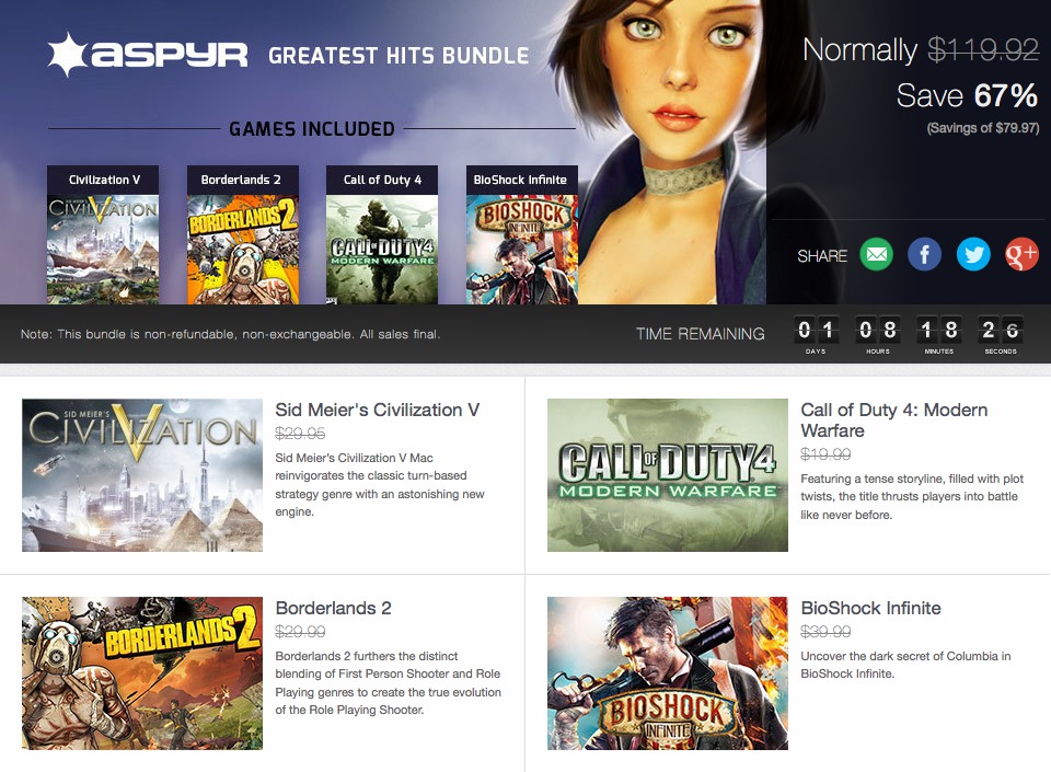 Společnost Aspyr nabízí prostřednictívm Macgamestore čtveřici her za zvýhodněnou cenu 39,99$. Jedná se o hry Sid Meier’s Civilization V, Call of Duty 4: Modern Warfare, Borderlands 2, BioShock Infinite. Balíček her můžete zakoupit přímo zde.