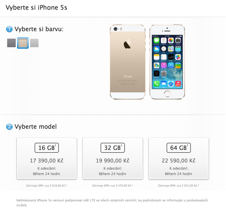 Apple skutečně dodržel svůj slib, který dal prostřednictvím Tima Cooka, jenž uvedl, že společnost udělá vše proto, aby byl dostatek telefonů iPhone 5s. Na internetovém obchodě Apple.cz se v současné době nabízí iPhone 5s s dobou odeslání do 24 hodin a to u všech modelů ve všech barvách. Je tedy jen a jen na vás jakou kapacitu a jakou barvu si u iPhone 5s zvolíte, Apple.cz vám jej odešle do 24 hodin od objednávky. Společnost Apple nejprve radikálně snížila dobu odeslání objednávky v minulém týdnu, kdy Apple.cz začal odesílat telefony za 3-5 pracovních dní a dnes již zvládá odesílat dokonce za 24 hodiny od objednávky.