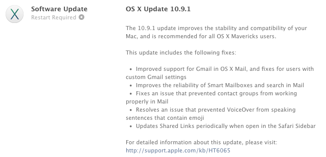 Iba pred pár minútami sa v ponuke Mac App Store objavila dlho očakávaná aktualizácia OS X Mavericks 10.9.1, ktorá rieši hneď niekoľko problémov. Zmeny sa týkajú predovšetkým aplikácie OS X Mail, keďže tá mala v prvotnej verzii Mavericks problémy s podporou Gmail. Podľa zoznamu zmien je však už teraz jasné, že Gmail nebola jediná problémová vlastnosť nového OS X Mail a update tiež rieši problémy s inteligentnými schránkami a skupinami kontaktov. Nový update už tradične vyžaduje reštart systému po inštalácii.