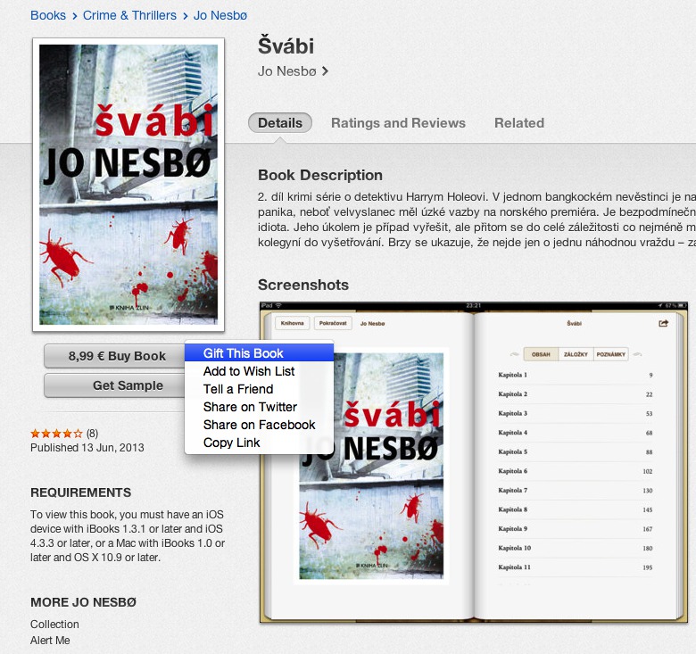 To co bylo již několik let samozřejmostí v iTunes App Store a v iTunes Store se nyní dostává také do iBooks Store. Apple začal nově umožňovat poslat knihy z iBooks Store jako dárek pomocí funkce Gift. Ta je již roky dostupná u filmů, hudby, aplikací a her, ovšem v iBooks se s ni setkáváme vůbec poprvé od vzniku tohoto internetového online obchodu s knihami. Pokud chcete někoho obdarovat knihou, postupujte následovně.