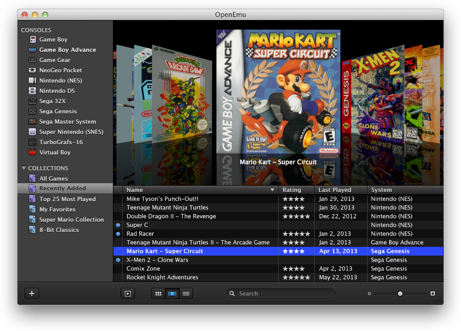 Ako tvrdia jeho autori, pri vývoji sa im podarilo docieliť toho, že emulátor zdieľa filozofiu s programami od Apple, čiže „jednoducho funguje“. Program už natívne podporuje 12 rôznych konzol, no väčšinu z nich tvoria zariadenia od Nintenda. Podporu konzoly Wii však nečakajte, predsa len ani dnes nie je možné emulovať takýto hardvér so 100-percentným úspechom. Na druhú stranu však môžu používatelia očakávať prístup k hrám zo starších konzol, medzi ktoré patrí aj napríklad SNES či Sega Genesis, ale aj Nintendo DS. Výhodou emulátora je aj to, že ponúka prostredie postavené na rovnakej báze ako ho poznáme z aplikácií iWork, teda v ňom môžu hráči jednoducho organizovať svoje hry do zoznamov, prípadne ich uvidia v prednastavených kategóriách, ktoré predstavujú názvy konzol. Puntičkári si prídu na svoje taktiež, keďže program plnohodnotne podporuje zobrazovanie Cover Artov pre hry, ako aj rôzne režimy zobrazenia. Okrem režimu zobrazenia v štýle zoznamu je tu aj možnosť zobraziť miniatúry hier a nechýba ani obľúbený Cover Flow, ktorý sa žiaľ postupne vytráca.