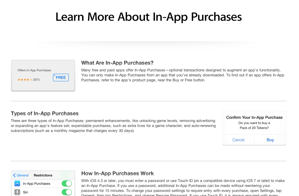 Až doposud Apple sice v sekci Features v iTunes App Store nabízel informace o takzvaných In-App Purchases, ovšem poté co jste si je chtěli přečíst, vás iTunes App Store automaticky přesměroval do Safari, kde se otevřela stránka popisující nákupy v rámci aplikací. Na tyto nákupy si přitom stěžovali především rodiče malých dětí, kteří mohli snadno nakupovat v rámci aplikací a podařilo se jim tak utratit několik stovek a mnohdy i tisíců dolarů během pár desítek minut hraní.