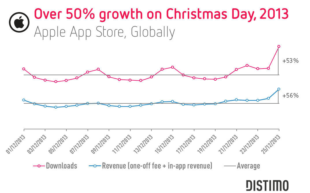 Netreba sa pritom čudovať, že najväčší nárast bol zaznamenaný v čase od 24. do 25. decembra/prosince, teda v dňoch, kedy si ľudia najčastejšie rozbaľujú svoje darčeky. Pozoruhodný nárast sa ukázal aj v čase od 7. do 9. decembra a od 14. do 15. decembra. Spoločnosť Distimo ale upozorňuje, že napriek pútavým číslám sa jedná o pokles oproti minulým rokom. V roku 2011 totiž Distimo odhalila až 70-percentný nárast tržieb v Štedrý deň. Medzi hlavných aktérov, ktorí sa postarali o rast zisku, patrí Spojené Kráľovstvo či Spojené štáty. Zatiaľ čo v USA bol zaznamenaný 97-percentný nárast, v Británii bol nárast až o 161%. V ekonomicky vyspelých ázijských krajinách, v Japonsku a v Južnej Kórei, bol zaznamenaný len nepatrný nárast tržieb.