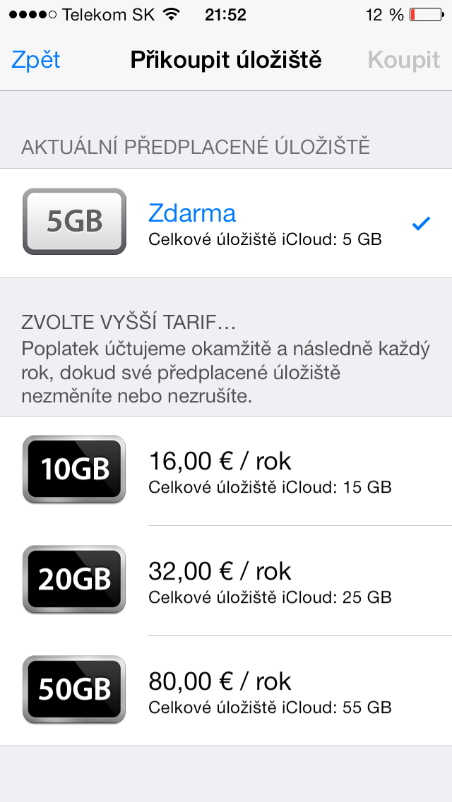 Musíme si přiznat, že Apple je co se iCloudu týká drahý, skutečně velmi drahý. Přece jen to za co Apple chce platit 16, 32 nebo dokonce 80€ za rok nám mnoho jiných služeb nabízí zdarma jako základní standard. Bohužel například na dropbox však své iOS zařízení nezálohujete a tak Apple spoléhá právě na to, že si musíte zaplatit za pohodlí, které iCloud nabízí při synchronizaci nebo obnově dat. Ceny jsou však i tak na můj vkus skutečně nadsazené a tak za roční navýšení z 5GB na 15GB zaplatíte 16€.