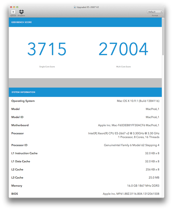 Společnost OWC jako první prohlásila, že procesor v novém Mac Pro bude možné vyměnit uživatelem bez nutnosti zásahu Applu. Nyní své slova potvrdila tím, že do počítače Mac Pro s procesorem Intel E5-1650 V2 6-core 3.50Ghz vložila nový procesor Intel E5-2667 V2 8-core 3.30GHz s 25MB L3 cache, čímž zvýšila jeho výkon o 30%. Zajímavé je, že tento procesor dokázal překonat ve výkonu také Applem nabízený osmi jádrový procesor Intel a v Geekbench testu dosáhl skóre 27 004 bodů, oproti 24 429, které dosáhl Mac Pro s osmi jádrovým procesorem dodávaným Applem.