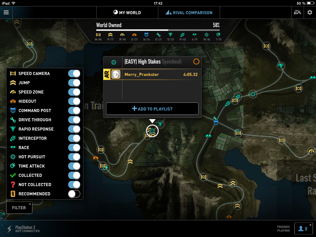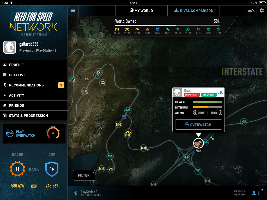 Po zapnutí a následnom prihlásení sa k vášmu Origin účtu sa iPad pokúsi automaticky pripojiť k vášmu PC alebo ku konzole, ak ju máte pripojenú k rovnakej WiFi sieti. Hlavným prvkom tejto aplikácie je mapa fiktívnej oblasti Redview County. Okrem možnosti navigovať sa k najbližšiemu závodu, či inej úlohe na mape je tu aj možnosť vydať sa do režimu OverWatch, na ktorý sa pozrieme neskôr. V aplikácií môžete sledovať aj vaše štatistiky, respektíve štatistiky ostatných hráčov, ktorých máte pridaných v zozname priateľov na Xbox Live alebo na PlayStation Network. Štatistiky tu sú až pozoruhodne detailné a dozviete sa v nich, ktoré závody vaši priatelia dokončili, ktorými radarmi prešli a koľko času strávili hraním hry. Poďme sa ale pozrieť na režim OverWatch.