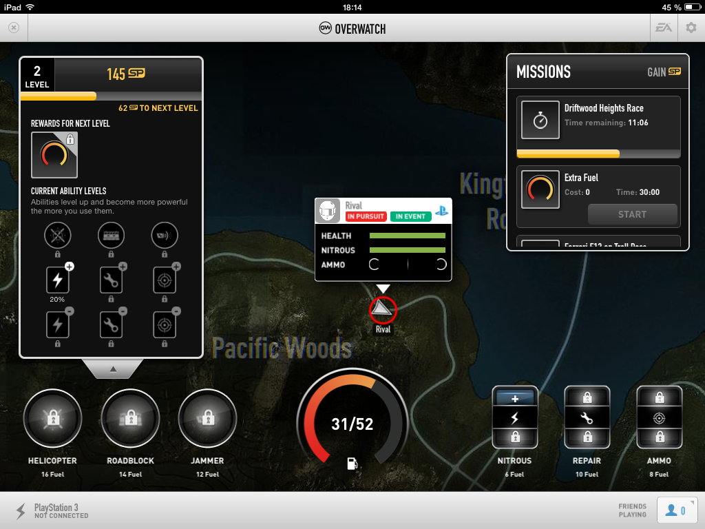Po zapnutí a následnom prihlásení sa k vášmu Origin účtu sa iPad pokúsi automaticky pripojiť k vášmu PC alebo ku konzole, ak ju máte pripojenú k rovnakej WiFi sieti. Hlavným prvkom tejto aplikácie je mapa fiktívnej oblasti Redview County. Okrem možnosti navigovať sa k najbližšiemu závodu, či inej úlohe na mape je tu aj možnosť vydať sa do režimu OverWatch, na ktorý sa pozrieme neskôr. V aplikácií môžete sledovať aj vaše štatistiky, respektíve štatistiky ostatných hráčov, ktorých máte pridaných v zozname priateľov na Xbox Live alebo na PlayStation Network. Štatistiky tu sú až pozoruhodne detailné a dozviete sa v nich, ktoré závody vaši priatelia dokončili, ktorými radarmi prešli a koľko času strávili hraním hry. Poďme sa ale pozrieť na režim OverWatch.