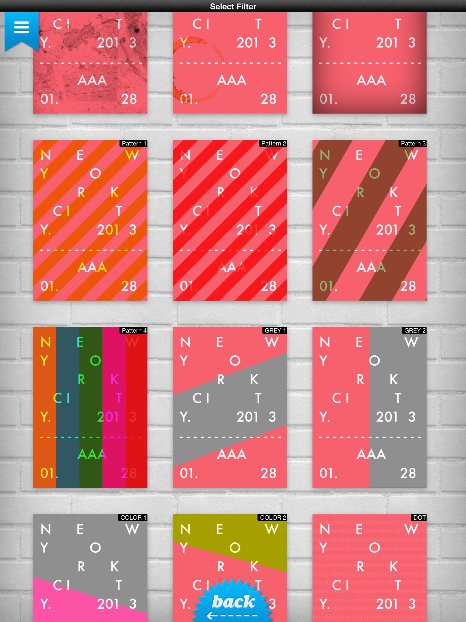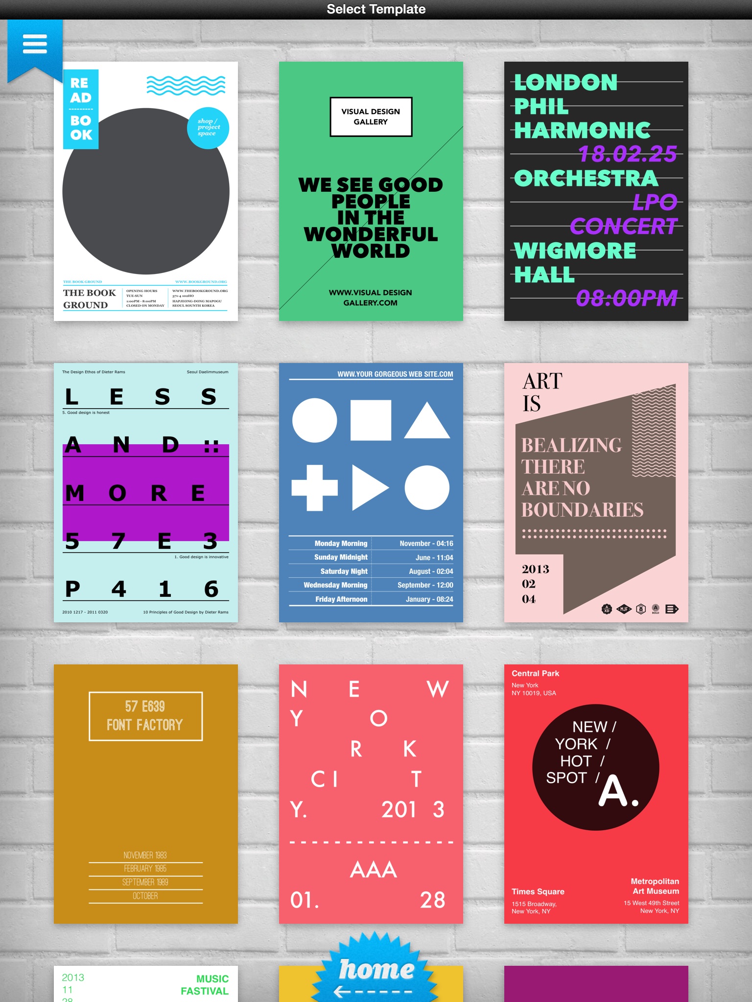 Phoster vás uvítá jednoduchým menu, ve které máte možnost vytvořit nový plakát nebo se podívat na již vytvořené. Po otevření první jmenované možnosti se zobrazí šablony, které jsou rozděleny na 5 kategorií: favorite, square pack, landscape pack, portrait pack a square pack 1 (v této kategorii si můžete dokoupit dalších 25 čtvercových šablon). Celý obsah aplikace se pak nachází na virtuální bílé cihlové zdi.