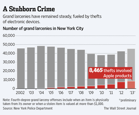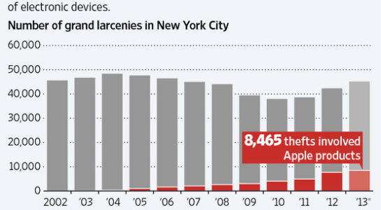 Kým v New Yorku tento druh kriminality rastie, z hľadiska celej USA sa počet krádeží znižuje. FBI tvrdí, že od roku 2002 do roku 2012 sa krádeže elektroniky znížili o 13%. Prečo ale zlodeji vyhľadávajú primárne zariadenia od Apple? Dôvod je podľa expertov jednoduchý. Zlodeji vyhľadávajú vždy tú najnovšiu a najlepšiu dostupnú elektroniku na trhu. Presne to isté sa dialo v časoch, keď sa na trh dostali prvé walkmany alebo sa do obehu dostali tenisky Michaela Jordana. To isté platí aj v prípade Apple produktov. V roku 2013 bolo v New Yorku ukradnutých takmer 8 500 zariadení, kým v roku 2002 to bolo len 25 produktov. Apple produkty tvorili v roku 2013 18% kradnutej elektroniky v New Yorku. Jedna z vecí, s ktorými NYPD nie je veľmi spokojná, je najmä ochota občanov v boji proti kriminalite. Iba malé množstvo okradnutých má záujem o vypátranie svojho telefónu. Krádež síce nahlásia na políciu, na druhú stranu nechcú sledovať fotografie potenciálnych zlodejov. V novembri/listopadu 2013 sa podarilo vypátrať len 20% zlodejov.