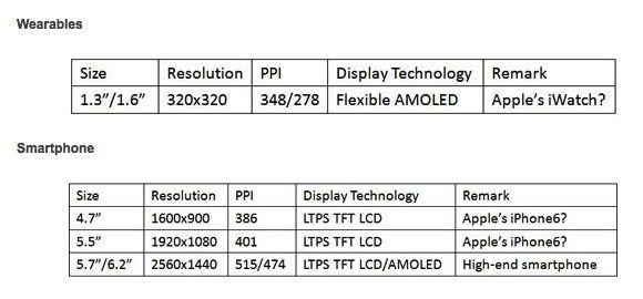 Podle DisplaySearch nabídnou hodinky iWatch displej o velikosti 1,3″ nebo 1,6″ s rozlišením 320×320 pixelů, což odpovídá hustotě 348, respektive 278 pixelů na jeden palec. iWatch budou disponovat technologií Flexible AMOLEd.