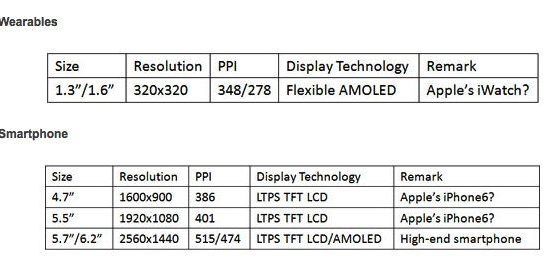 Telefon iPhone 6 by pak měl nabídnout buď displej o velikosti 4,7″ s rozlišením 1600×900 pixelů s hustotou 386 pixelů na palec nebo 5,5″ displej s rozlišením FULL HD, tedy 1920×1080, což odpovídá hustotě 401 pixelů na palec. Ať už Apple zvolí první nebo druhou velikost, nabídnou oba displeje technologii LTPS TFT LCD. Kromě toho by měl Apple nabídnout také větší Phablet, který by měl disponovat 5,7″ nebo 6,2″ displejem s technologií LTPS TFT LCD nebo AMOLED a nabídne rozlišení 2560×1440 pixelů, což odpovídá u menší velikosti hustotě 515ppi a u větší varianty 474ppi.