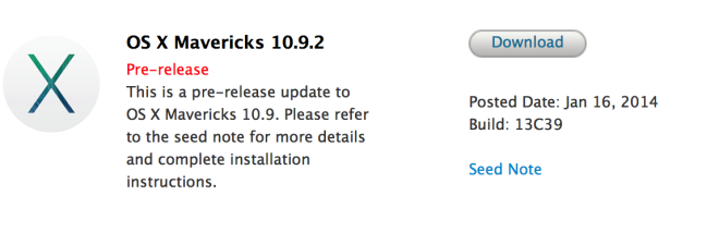 Apple rozposlal vývojárom novú testovaciu verziu operačného systému OS X 10.9.2 Mavericks, ktorý odstraňuje ďalšie chyby a pridáva nové funkcie do operačného systému OS X Mavericks. Táto beta verzia obsahuje zostavu 13C39 a prináša možnosť blokovať ľudí v službách iMessage a FaceTime, pričom zoznam blokovaných kontaktov sa synchronizuje so systémom iOS 7. Beta verzia OS X 10.9.2 je dostupná len pre registrovaných vývojárov, ktorí si ju môžu stiahnuť buď z webovej stránky alebo z ponuky Software Update.