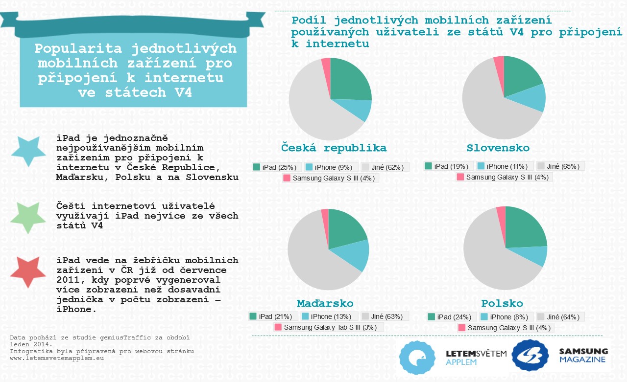 Podle výsledků studie gemiusTraffic je iPad jednoznačně nejpoužívanějším mobilním zařízením pro připojení k internetu v České Republice, Maďarsku, Polsku a na Slovensku: v těchto státech z něj pochází kolem 20‒25 % zobrazení stránek. Z iPadu pochází více než čtvrtina mobilních zobrazení stránek provedených českými internetovými uživateli, což je nejvíce ze všech států V4. Tento přístroj od značky Apple vede u nás na žebříčku mobilních zařízení již od července 2011, kdy poprvé vygeneroval více zobrazení než dosavadní jednička v počtu zobrazení ‒ iPhone. Největší popularitu si držel iPad po celý rok 2012, kdy generoval kolem 26‒27 % zobrazení, a svého maxima dosáhl přesně před rokem: v lednu 2013 generoval tento tablet 27,5 % všech mobilních zobrazení na webových stránkách zapojených do projektu. Od této doby podíl zobrazení pocházejících z iPadu mírně klesá na úkor nových modelů jiných značek jako například Samsung či Sony. Nicméně tento pokles se pohyboval v roce 2013 na všech zkoumaných trzích kolem 1‒2 procentních bodů, je tedy možné říci, že pozice iPadu je stabilní. Nejnižší podíl zobrazení stránek ve státech V4 generuje tablet značky Apple na Slovensku, a to pouze 19,5 %.