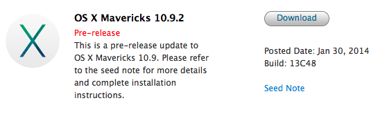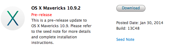 Apple vydal novou verzi OS X 10.9.2 určenou pro vývojáře. Nové testovací sestavení nese označení 13C48 a Apple stejně jako v dřívějších verzíhc žádá vývojáře, aby se zaměřili na řešení testování aplikací mail, iMessages, grafické ovladače, VoiceOver, VPN a SMB2.