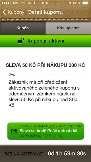 Společnost Mafra proto vytvořila aplikaci Portmonka, ve které máte automaticky k dispozici slevové kupóny množství partnerů aplikace, které jsou zcela zdarma bez toho, aniž byste se museli složitě registrovat nebo pro získání slevového kupónu udělat cokoli jiného, než stáhnout samotnou aplikaci. Aplikace je rozdělena do několika částí a její vzhled působí skutečně jako digitální peněženka. Je přehledný a milovníci skeuomorphismu si přijdou na své. V první záložce se setkáte s již zmíněnými slevovými kupóny, které můžete okamžitě uplatnit. Sleva se týká vždy konkrétního obchodu, aplikace vám ukáže kde je jeho nejbližší prodejna a následně můžete aktivovat slevový kód, který je aktivní po dobu dvou hodin. Dojdete k pokladně, ukážete kód nebo text ve kterém je sleva označena a personál se o vás již postará. Zde je potřeba zdůraznit, že Mafra dokázala skutečně apelovat na proškolení personálu partnerských společností, aby nedocházelo k nejasnostem a portmonku tak všichni dobře znají. Akce se objevují v aplikaci pravidelně a máte je možnost uplatnit vždy do nějakého data.