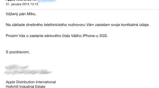 Musím sa priznať, že spočiatku som si vôbec nebol istý tým, či si môj e-mail niekto prečíta. Tak či onak, ponáhľal som sa a po odoslaní e-mailu som už len dúfal, že si môj e-mail v Cupertine prečítajú. Po pár hodinách sa na obrazovke môjho telefónu zjavilo telefónne číslo s Írskou predvoľbou a pretože som takéto číslo v živote nevidel, rozhodol som sa, že hovor prijmem. Z opačného konca sa ozval príjemný slovenský hlas ženy, ktorá hneď na úvod vysvetlila, že mi telefonuje kvôli e-mailu, ktorý som ráno odoslal pánovi Timu Cookovi! Vtedy mi bolo okamžite jasné, že môj e-mail bol skutočne prečítaný a že sa Apple so mnou spojil, aby mi pomohol. Behom telefonického rozhovoru, ktorý netrval ani 5 minút, som dokázal vysvetliť, ako sa vlastne môj iPhone 3GS pokazil a dozvedel som sa, čo mám robiť ďalej.