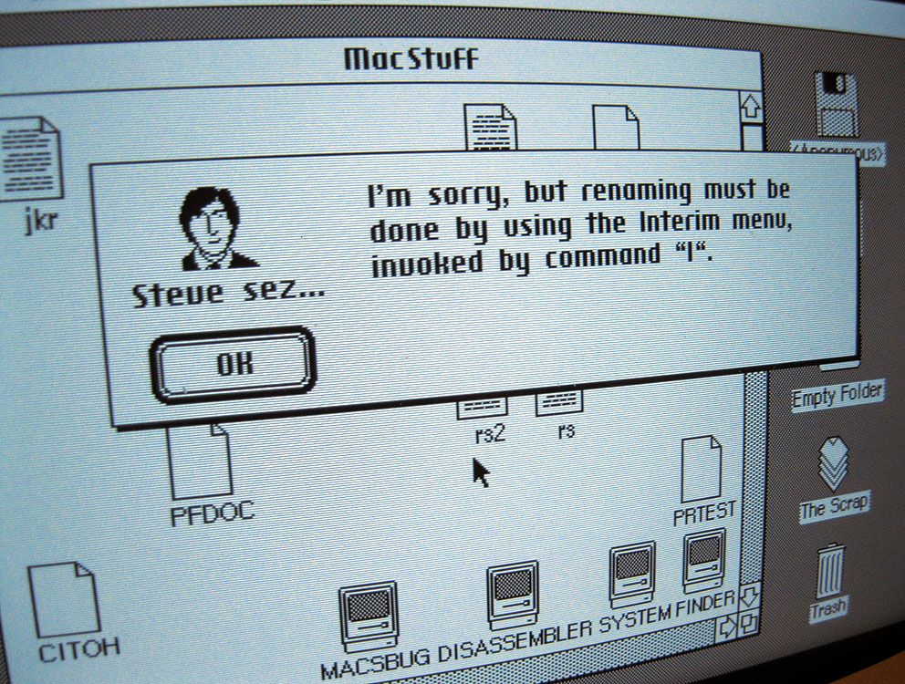 Nakoniec sa Goolevitch podelil aj o fotografie, na ktorých môžeme vidieť prototyp systému Macintosh. Zaujímavosťou je, že tento prototyp obsahoval množstvo ikon, ktoré sa vo finálnej verzii vôbec neobjavili. Hneď na úvod to je ikona @ namiesto loga Apple a ikony. Zároveň sa menili aj názvy – Finder sa v tej dobe volal MacStuff a MacWrite sa pre zmenu volal MacAuthor. Nachádzame tu aj ikony akýchsi tvárí. Nie je známe, komu tieto tváre prináležia, no špekuluje sa, že sa jedná o typický výraz vývojárov, ktorí pod Stevom Jobsom strávili desiatky hodín vyvíjaním systému Macintosh. Zaujímavosťou je, že dialógové okná vtedy obsahovali ikonku „Steve sez…“, čo znamená „Steve says“, teda „Steve hovorí“. Nebyť toho, že Apple odstráni Steva zo systému Mac, Steve by radil užívateľom ešte aspoň desať rokov po tom, ako bol z Applu vyhodený!