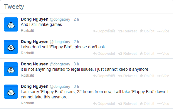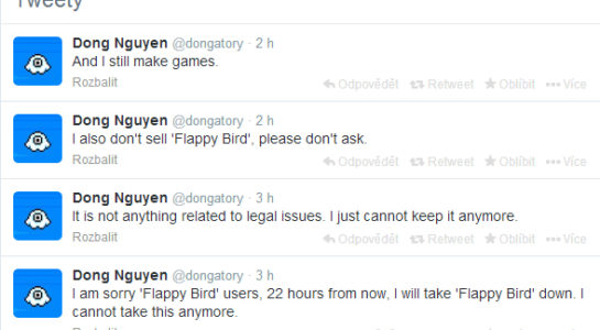 Ponuka obchodu App Store sa mení prakticky každý deň a zatiaľ čo dnes si tam stiahnete svoju obľúbenú hru, zajtra ju už v obchode nemusíte nájsť. Práve to je prípad titulu Flappy Bird, ktorý sa práve v týchto dňoch nachádza na prvých miestach v iTunes App Store a v Google Play. Nie, že by táto hra porušovala podmienky, ale ako sa ukazuje, jej autor nedokázal uniesť popularitu, akú mi hra priniesla. Dong Nguyen na svojom Twitteri zverejnil, že mu hra zničila život a hra Flappy Bird bude zajtra o 18:00 odstránená zo všetkých obchodov.