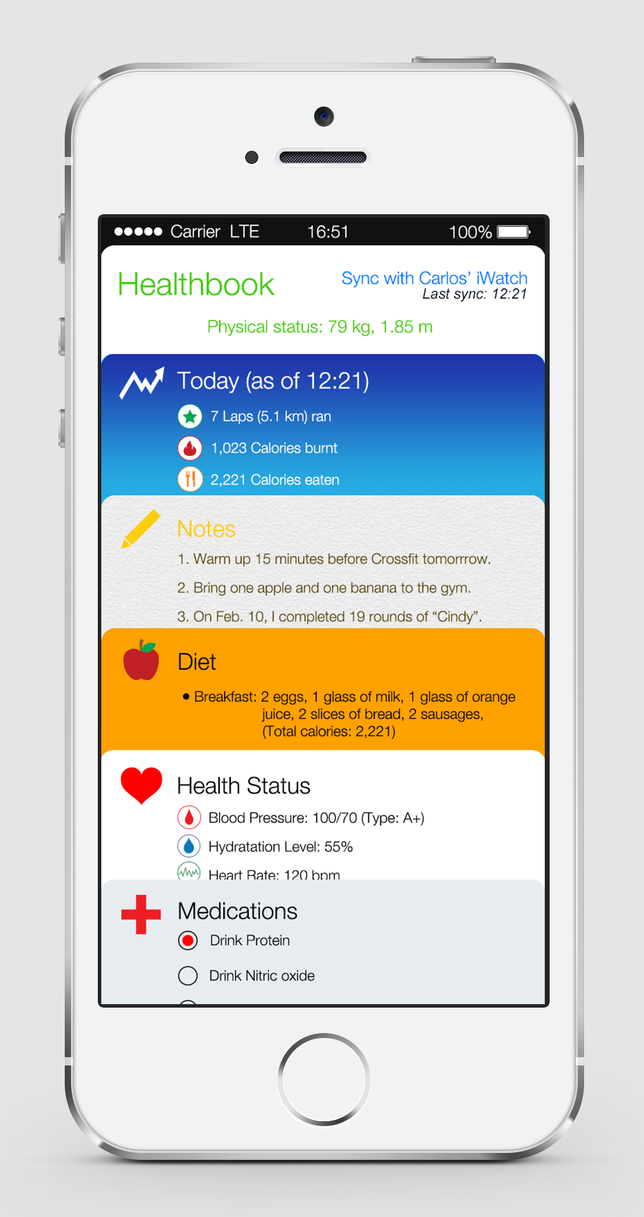 Uživatel diskusního fóra serveru Macrumors s přezdívkou CarlosGQ, dnes zveřejnil první koncept aplikace Healthbook. Ten je skutečně povedený a je jasné, že Apple se podobným směrem u své nové předinstalované aplikace bude ubírat. Informace o aplikaci Healthbook se objevily začátkem února s tím, že se bude jednat o aplikaci, jenž bude součástí operačního systému iOS 8 a postará se, o monitorování našich tělesných aktivit. Aplikace má být úzce spojena s koprocesorem M7 a také s hodinkami iWatch.