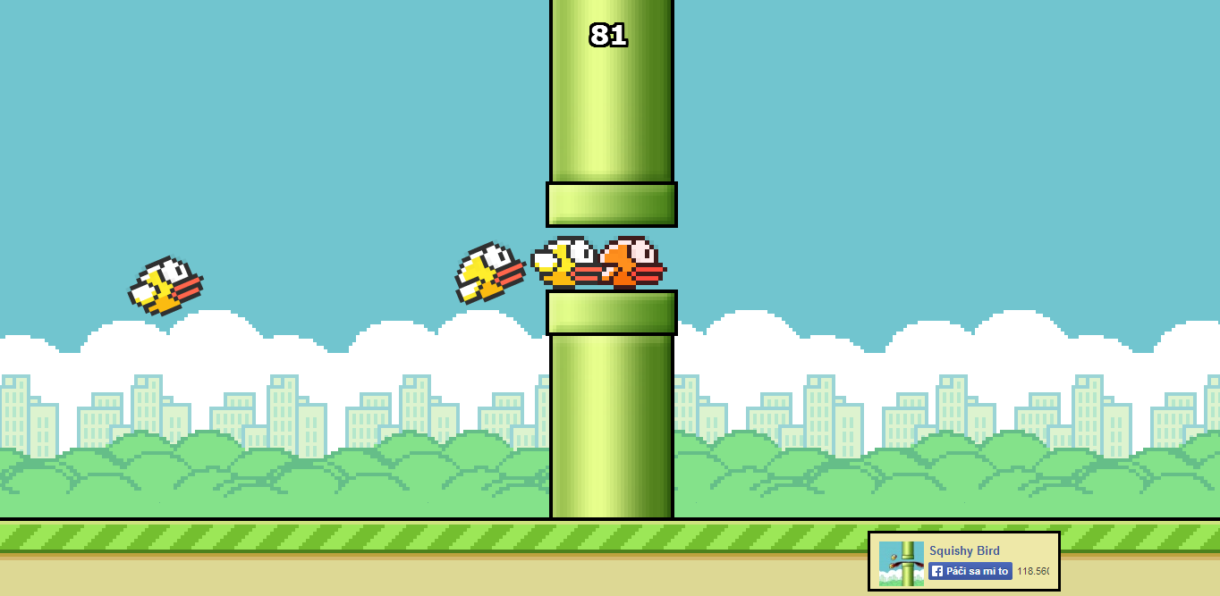 Fenomén Flappy Bird si získal fanúšikov aj nepriateľov. Netreba sa čudovať, keď o tejto hre musia čítať na internete a v iTunes App Store nájdu asi 30 rôznych klonov. Podobne na tom bol aj autor novej počítačovej hry Squishy Bird, v ktorej je vašou úlohou zabiť čo najväčší počet pixelových vtákov. K tomu využijete práve zelené potrubia, ktorým sa musíte v pôvodnej hre vyhýbať. Samotná hra je postavená na internetovom rozhraní a prekvapivo sa mi ju podarilo spustiť aj na iPade mini. Tam sa ale hra nedá ovládať.