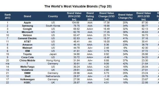 Nejhodnotnější značkou na světě zůstává i v letošním roce společnost Apple, jejíž hodnota je v současné době 104,68 miliard dolarů, tedy zhruba 2,1 bilionu korun. Zajímavé je, že na druhém místě se umístil další technologický gigant, společnost Samsung, jejíž hodnota však vzrostla meziročně o 34%, zatím co hodnota Applu pouze o 20%. Nejlépe rozpoznatelnou značkou je již druhým rokem za sebou Ferrari. Nejnovější žebříček vypovídající o hodnotě jednotlivých společnosti vydala společnost Brand Financ.