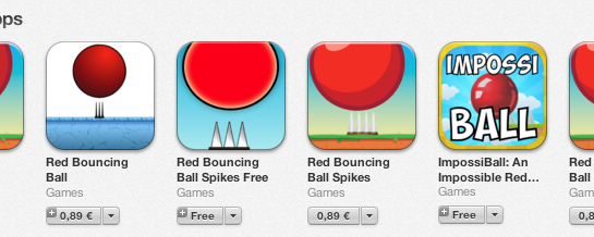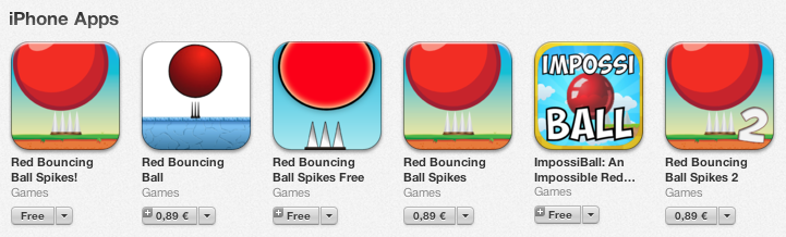 Server TechCrunch pronikl do fascinujícího světa podvodníků v iTunes App store, kteří dokáží díky hře vtvořené na základě šablony za 10$, vydělávat až 10 000 dolarů denně. Dokument zveřejnění TechCrunch tvrdí, že vývojář hry Red bouncing Balls Spikes tuto hru vytvořil na základě šablony, která je dostupná za pouhých deset doarů. Hra byla v iTunes App store již několik měsíců jako zdarma dostupná hra, kterou si mohl každý stáhnout, přesto však byla na velice průměrných místech v žebříčku nejstahovanějších aplikací.
