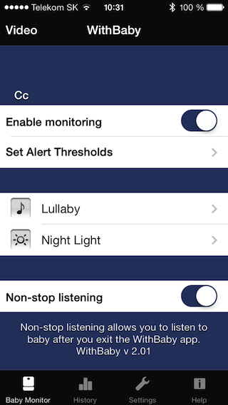 Zde se dostáváme k hlavní výhodě chůvičky. Tu je totiž možné používat nejen v lokální Wi-Fi síti, ale také klasicky přes internet. Pokud jste tedy na druhém konci světa a manželka stráží váš malý zázrak v poklidu domova, máte možnost se na své miminko i tak podívat přímo přes chůvičku. Nastavení chůvičky je poměrně snadné, stačí zapnout v iOS nebo Android zařízení Bluetooth a připojit se přímo k chůvičce. Ta vás následně vyzve k instalaci zdarma dostupné aplikace WithBaby, která je dostupná jak pro iOS, tak také pro Android. Následně vás již provede konfigurací samotná aplikace a během několika málo vteřin můžete chůvičku začít používat.