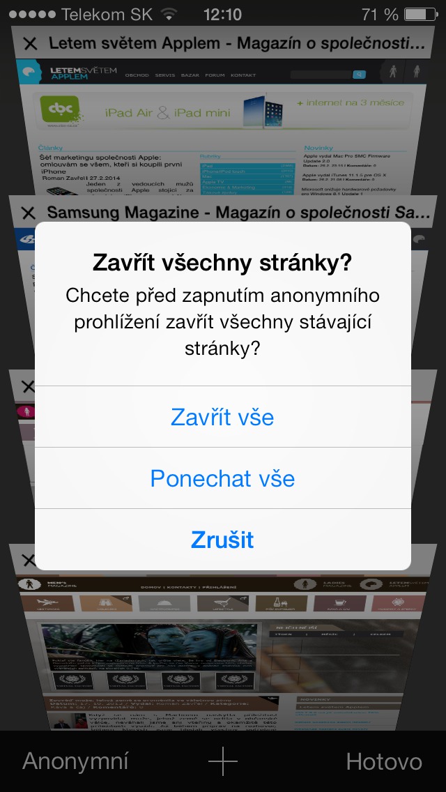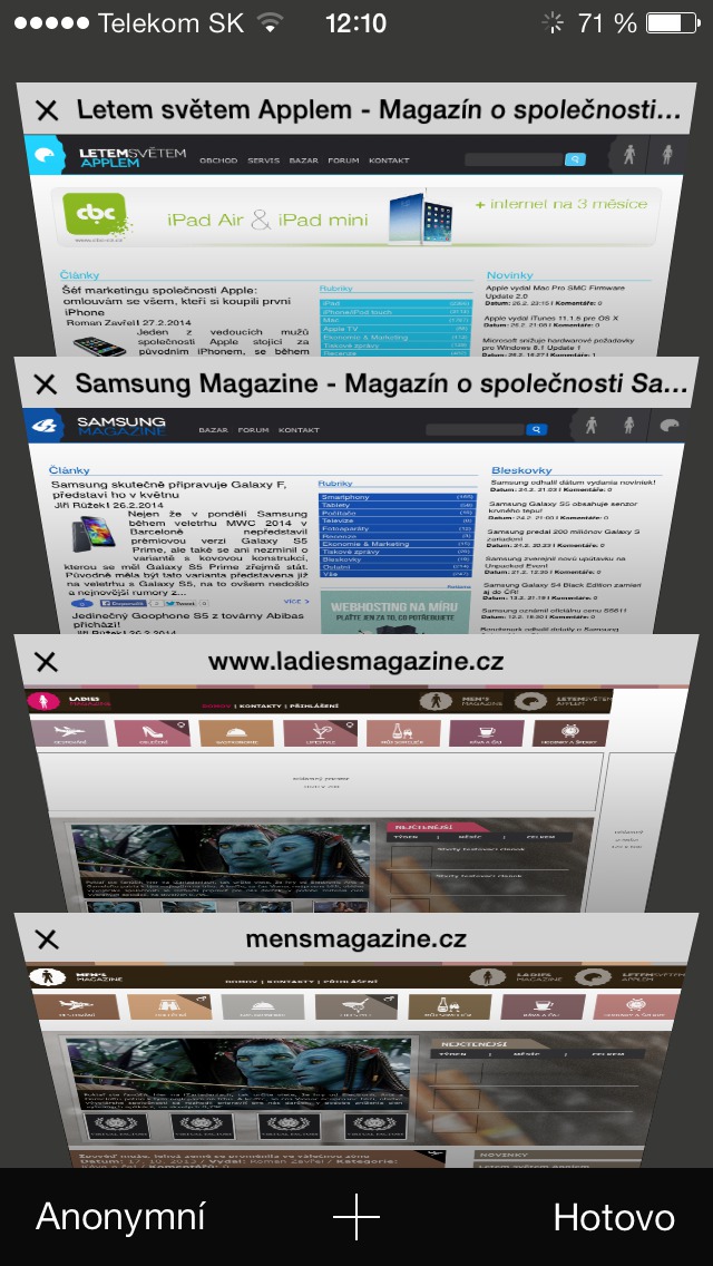 iOS 7 přináší zcela nové rozhraní nejen samotného systému, ale také aplikace Safari. Jednotlivé stránky již nemáme vedle sebe v tabech, ale můžeme jimi listovat. To však přináší také nevýhodu v tom, že nemáme kontrolu nad počtem otevřených oken a zejména uživatele starších zařízení jako je iPhone 4, mi jistě dají zapravdu, že s počtem otevřených oken přímo úměrně klesá také rychlost reakcí samotného prohlížeče a také celého přístroje.