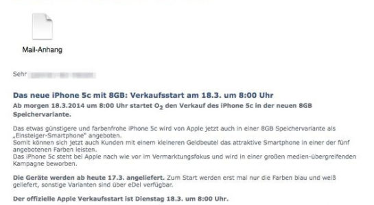 Zmienka o lacnejšej verzii iPhone 5c sa objavila najprv v informatívnom maili pre predavačov nemeckého O2, pričom telefón sa má na úvod predávať v bielej a modrej farebnej verzii. Sú to pritom práve tieto verzie, ktoré sú na svetovom trhu najrozšírenejšie. E-mail zároveň tvrdí, že spoločnosť neskôr doplní aj ďalšie farebné verzie. Cena zatiaľ nebola odhalená, no vzhľadom k súčasnej politike Applu sa bude tento telefón predávať za 449 dolárov, respektíve 449€. „Zlacnenie“ iPhone 5c sa však dalo čakať. Už samotný Tim Cook pri oznamovaní finančných výsledkov odpovedal na otázku, že ak Apple uzná, že je treba zlacniť niektorý produkt, určite tak spraví, ale nie pri oznamovaní finančných výsledkov.